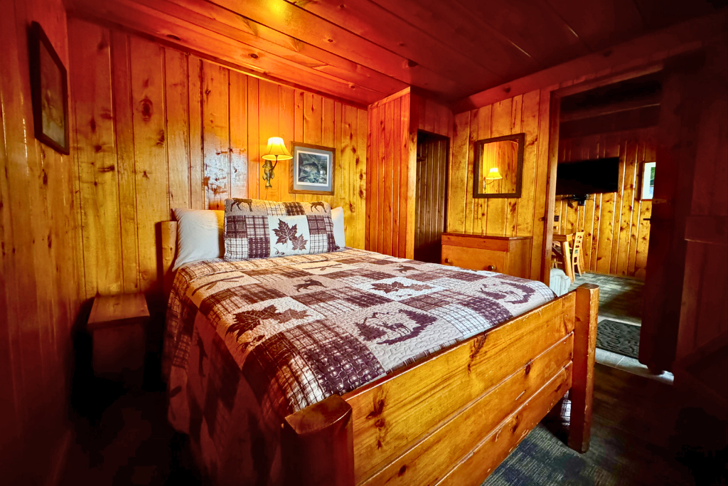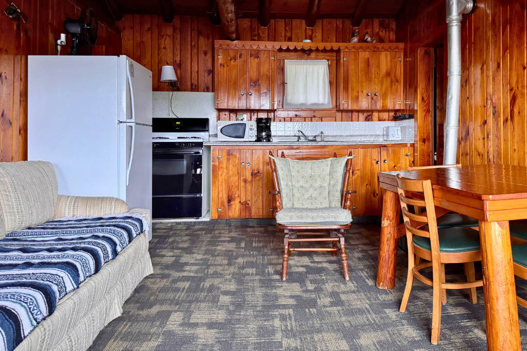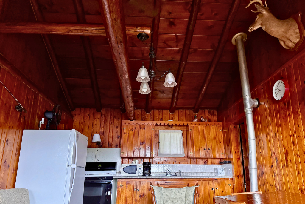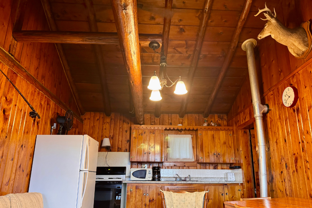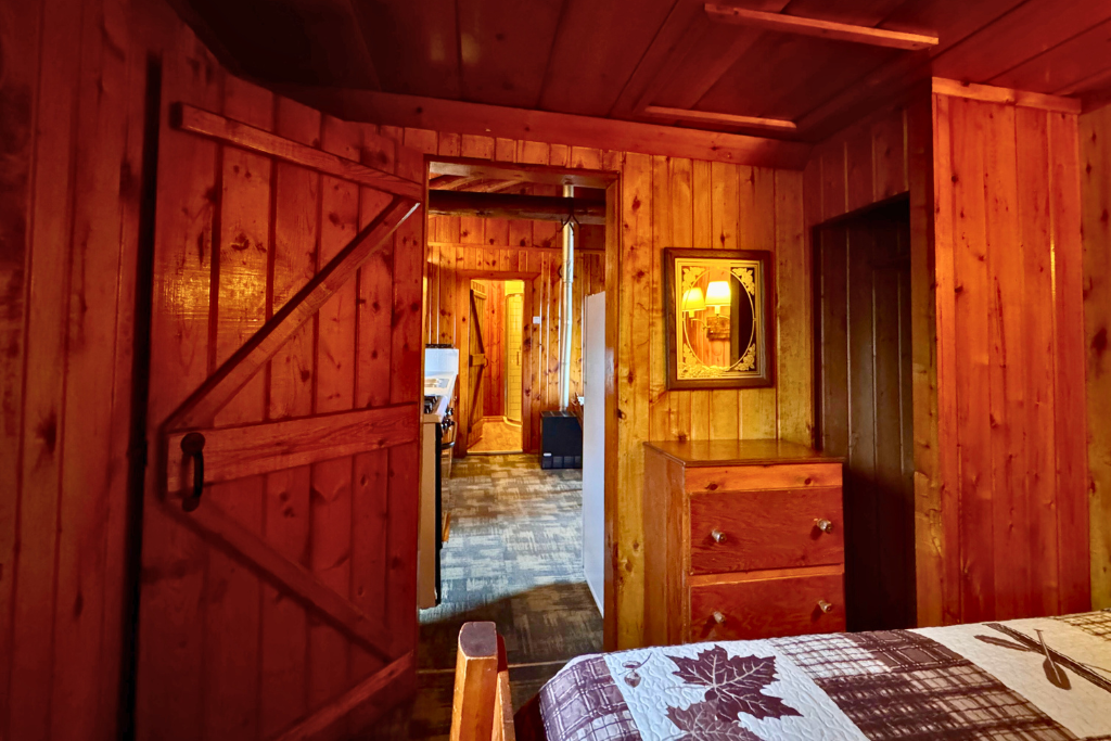 Cabin #1 is located on the “edge” of the resort with woods to the right and Cabin #2 to the left. This cabin has high vaulted ceilings, log beams and rustic wood finishes throughout.