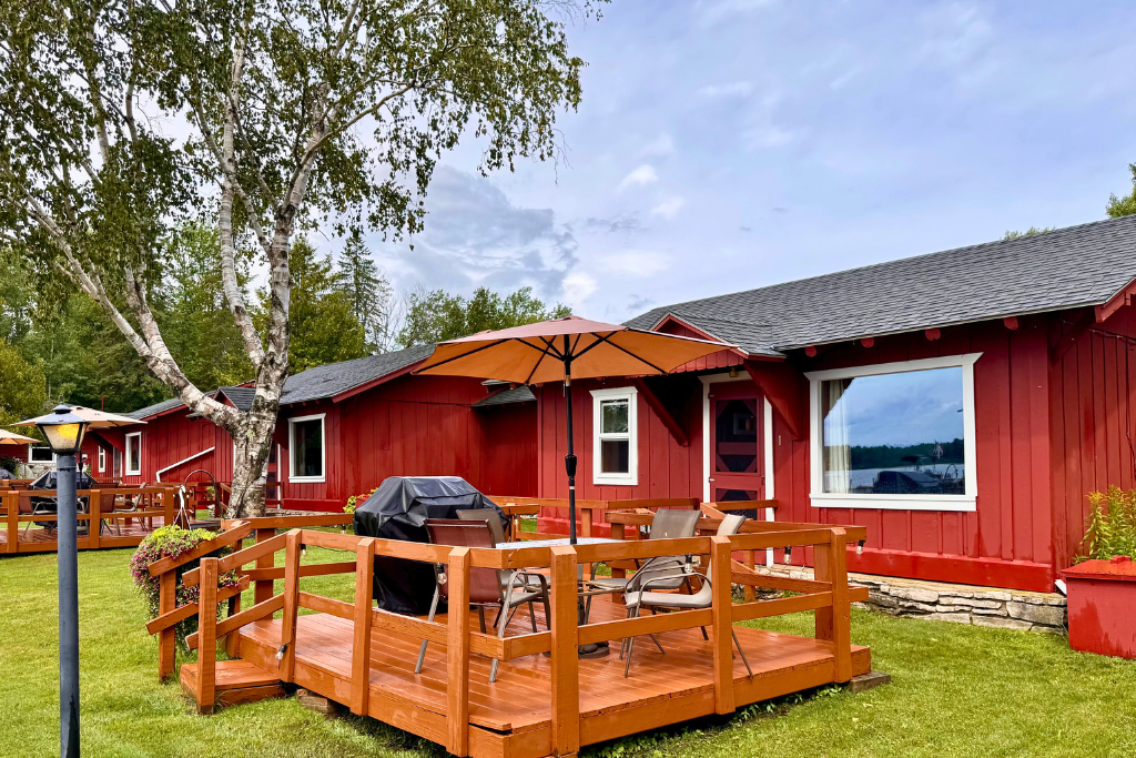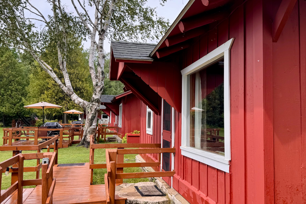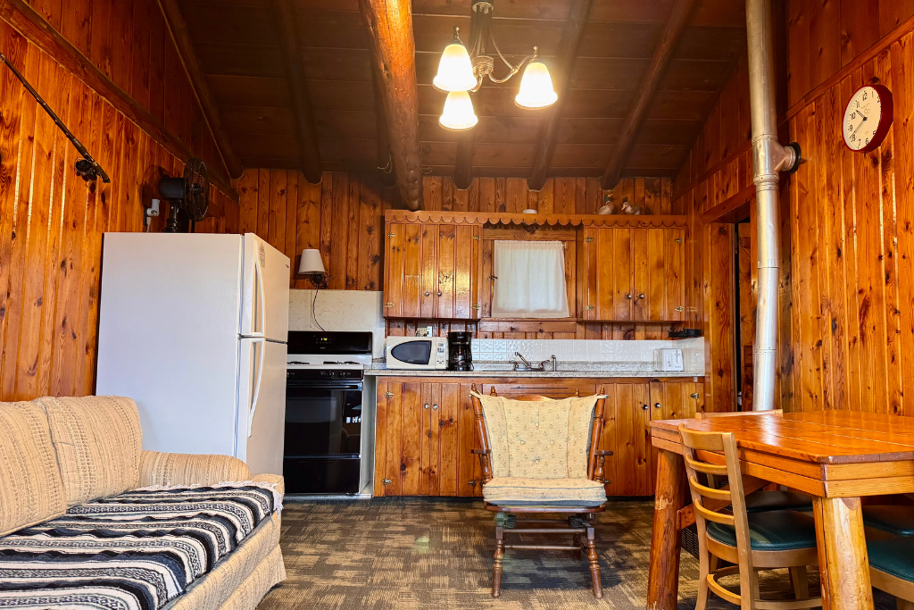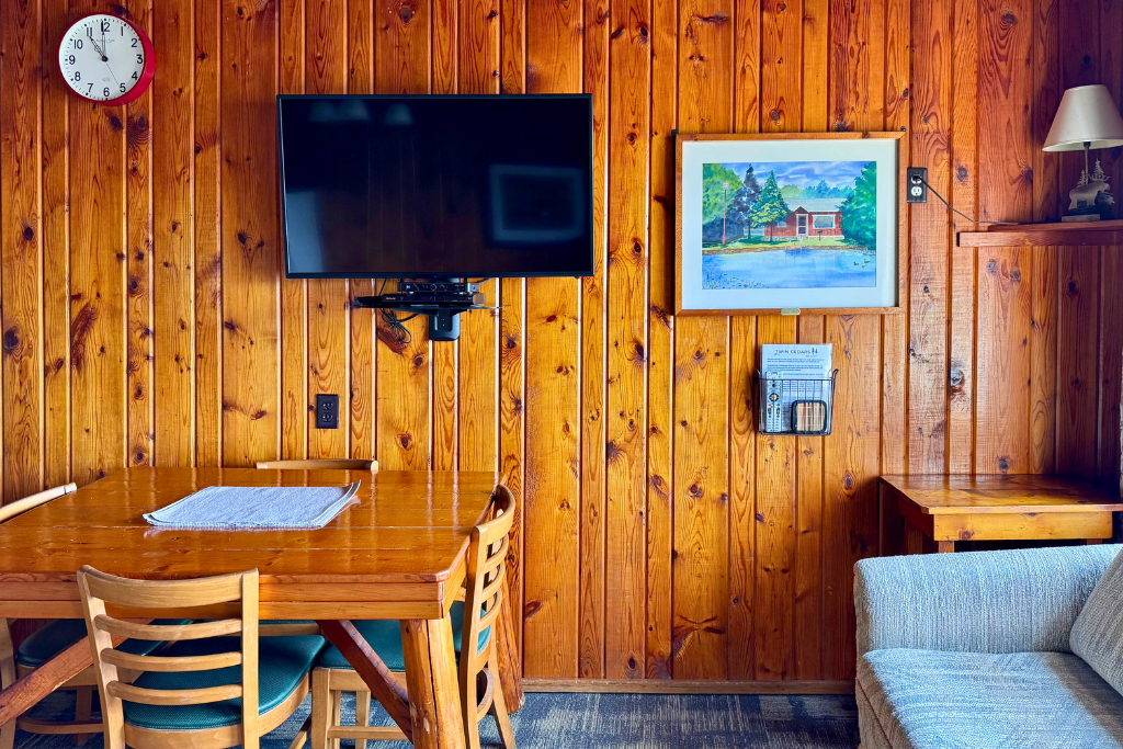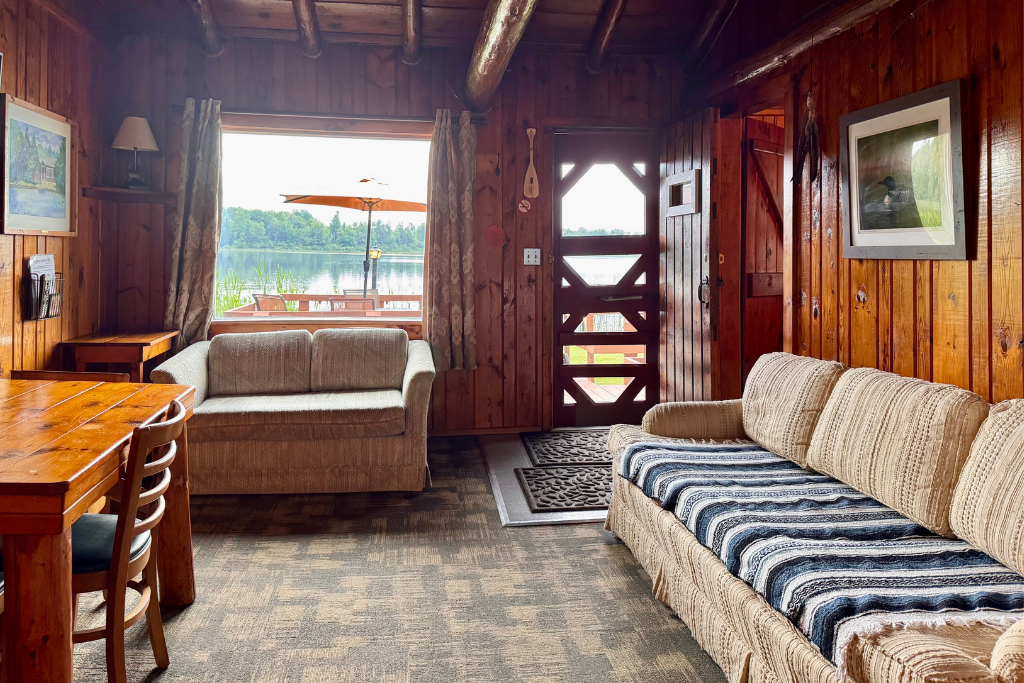 Cabin #1 is located on the “edge” of the resort with woods to the right and Cabin #2 to the left. This cabin has high vaulted ceilings, log beams and rustic wood finishes throughout.
