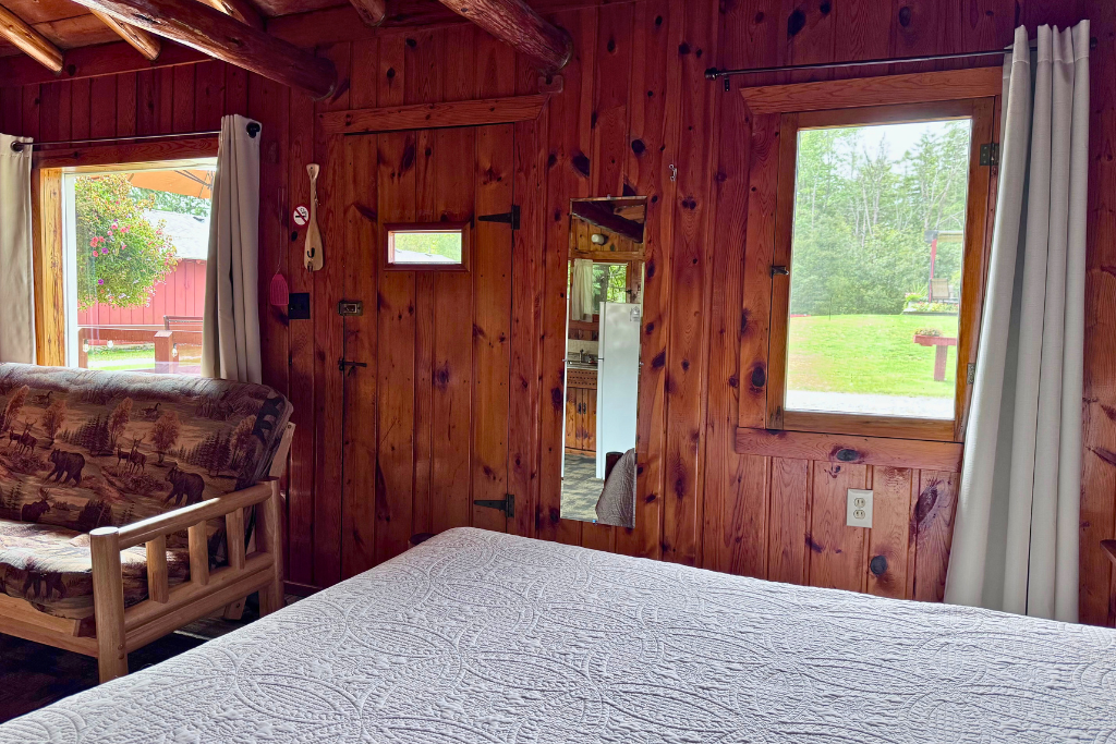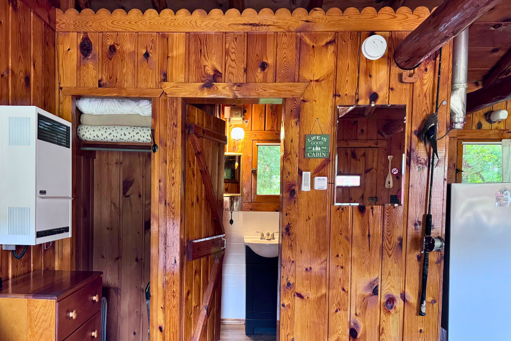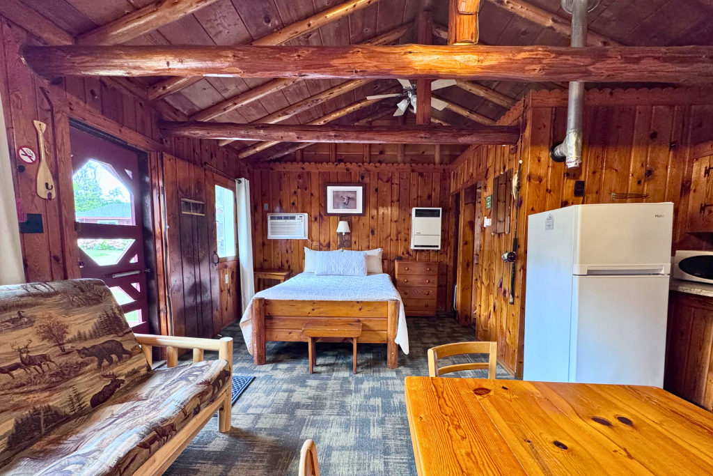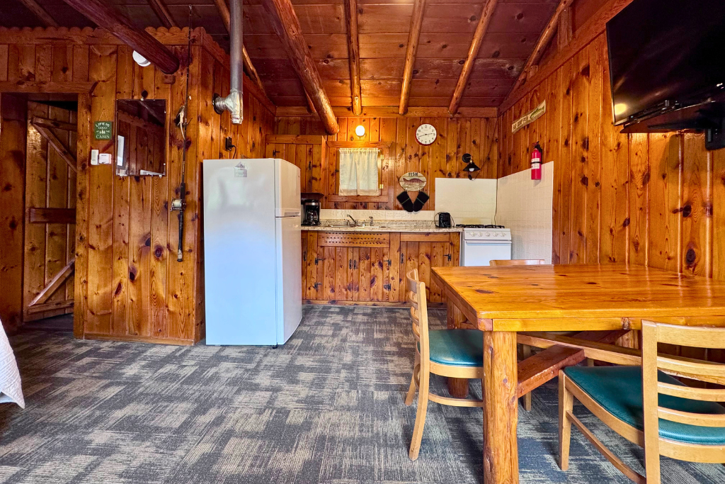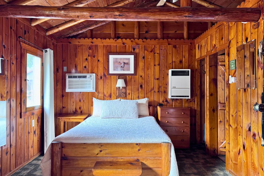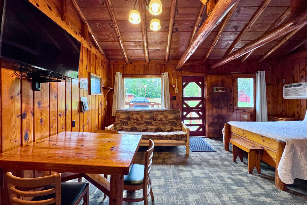 We call this one our honeymoon cabin. Adorable! With high vaulted ceilings, wood beams and rustic wood finishes throughout. This is a one room cabin perfect for 2 adults and 1 or 2 small children.