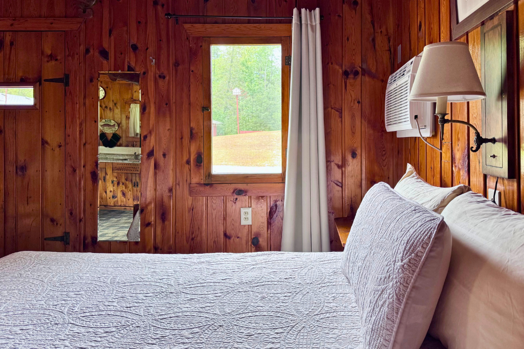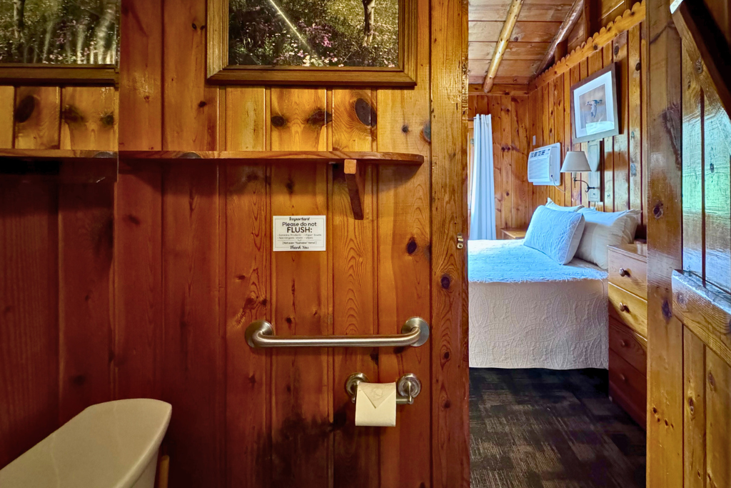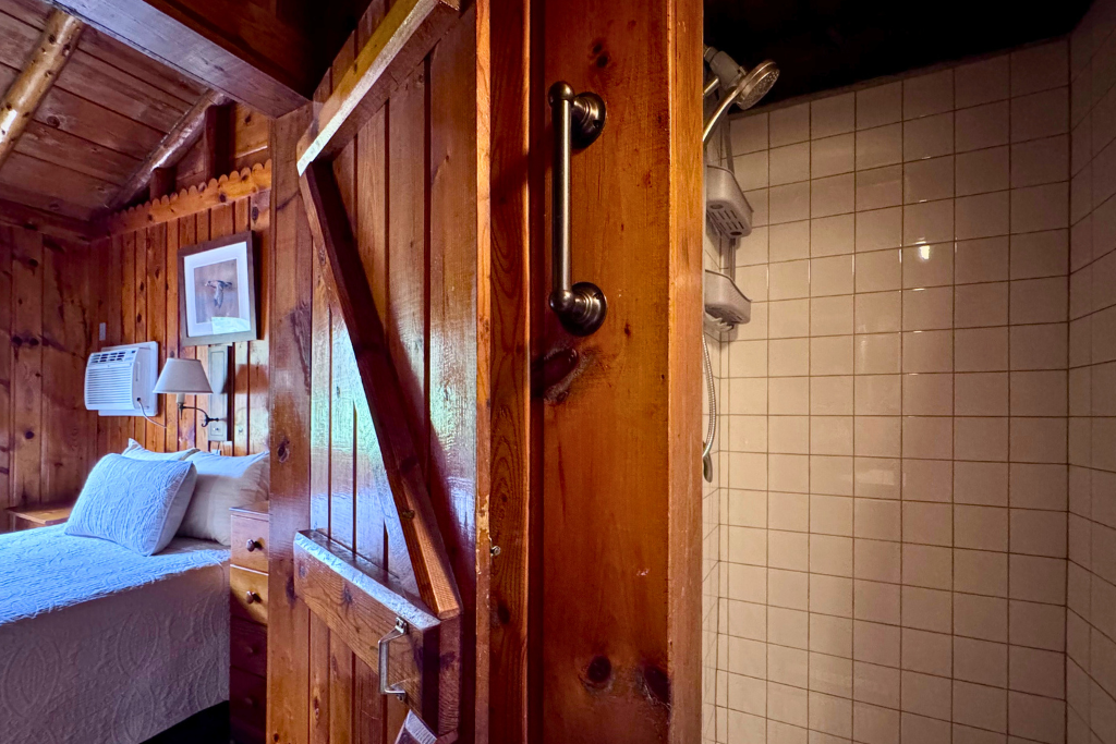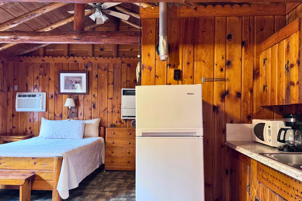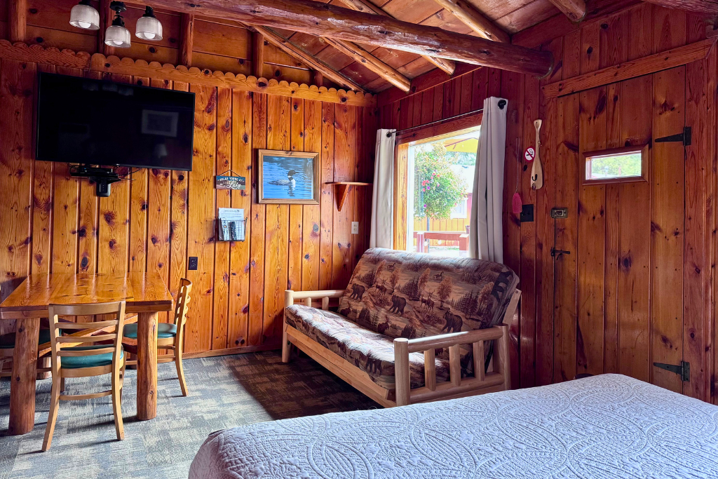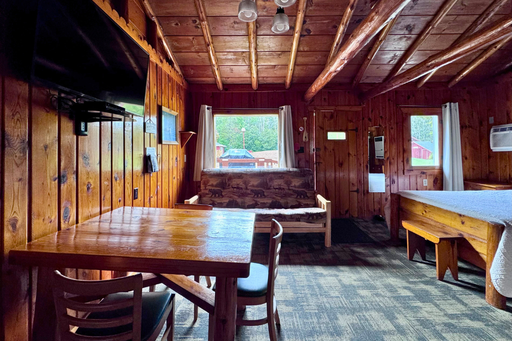 We call this one our honeymoon cabin. Adorable! With high vaulted ceilings, wood beams and rustic wood finishes throughout. This is a one room cabin perfect for 2 adults and 1 or 2 small children.