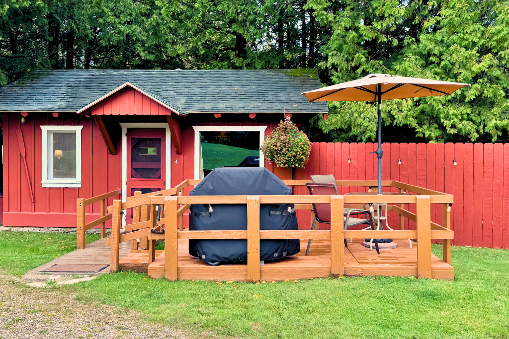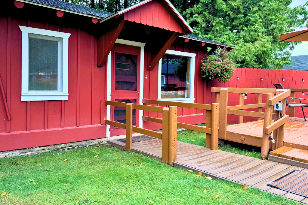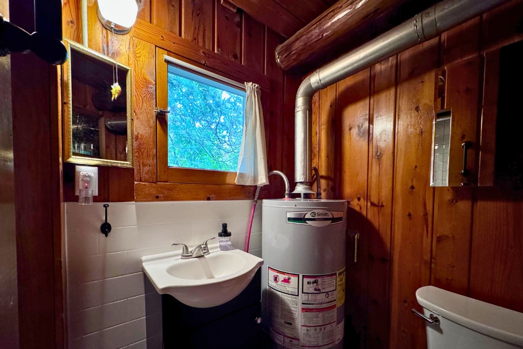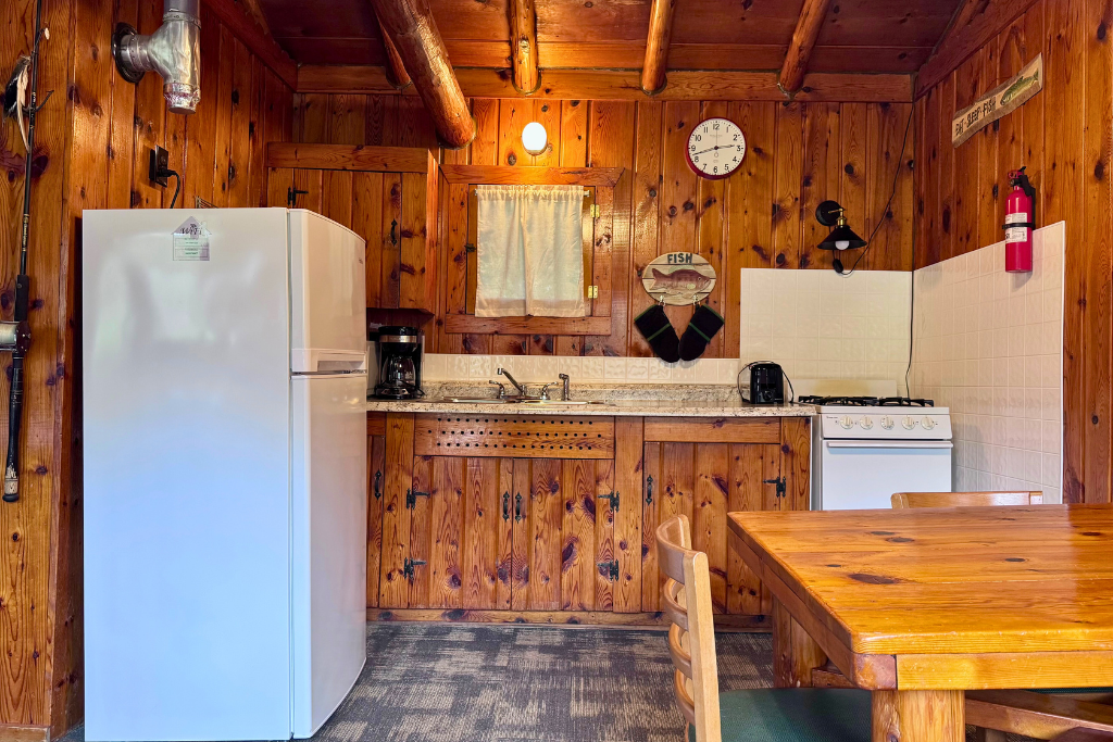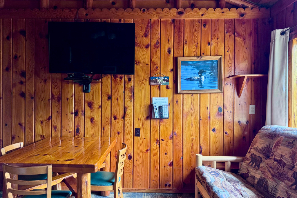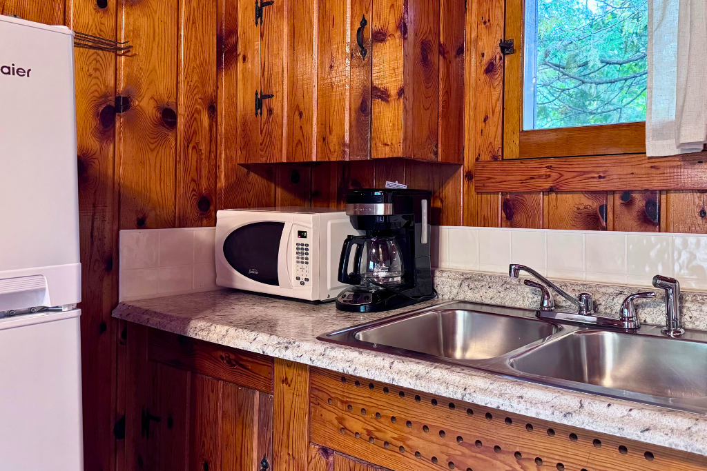 We call this one our honeymoon cabin. Adorable! With high vaulted ceilings, wood beams and rustic wood finishes throughout. This is a one room cabin perfect for 2 adults and 1 or 2 small children.